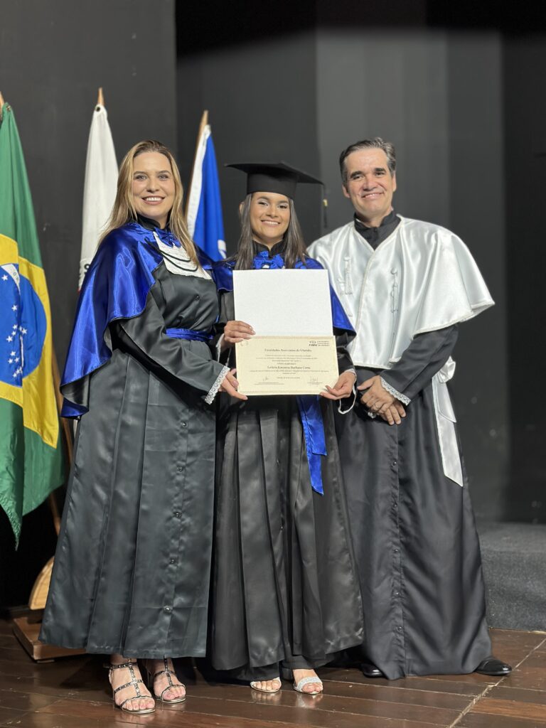 Um dos momentos mais aguardados da noite foi a entrega da Láurea Acadêmica, honraria instituída pela Resolução nº 10/2009 do Conselho Superior da Fazu. O reconhecimento é concedido ao formando que obteve excelência acadêmica ao longo do curso, com média geral superior a 85 pontos, sem reprovações e com assiduidade exemplar. Além do certificado, os laureados foram contemplados com um curso de pós-graduação da instituição.